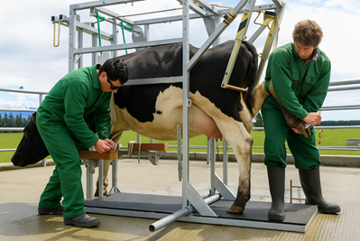 Сначала животное необходимо надёжно зафиксировать. Для этого используют специальные станки, позволяющие удерживать корову в стоячем положении. Они оснащены фиксаторами для копыт, подсветкой рабочей зоны и отделениями для инструментов, что делает процесс безопаснее и удобнее.